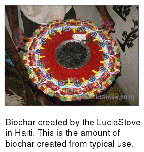With regard to climate change, the most important thing to know is that this stove is carbon negative. This means the stove emits less C02 than if the biomass had been burnt using three-rocks-and-a-pot. What’s more, the CO2 produced by the stove is actually sequestered in the form of biochar. Biochar has come to be seen as a very valuable substance that can be used for many purposes, especially to enrich the soils in exhausted agricultural lands. That’s one reason why the stove is very attractive to country like Haiti, where the soil is so depleted of nutrients.