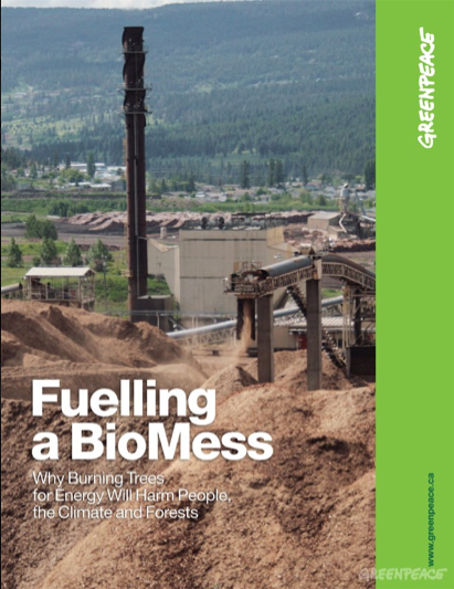 “Greenpeace released a science-based report today that highlights the dangers of the large-scale use of wood and tree harvesting for heating, electricity generation or liquid biofuels. The report, entitled ‘Fuelling a Biomess’, argues that burning woody biomass on an industrial scale could severely harm Canada’s public forests and further contribute to the global climate crisis.