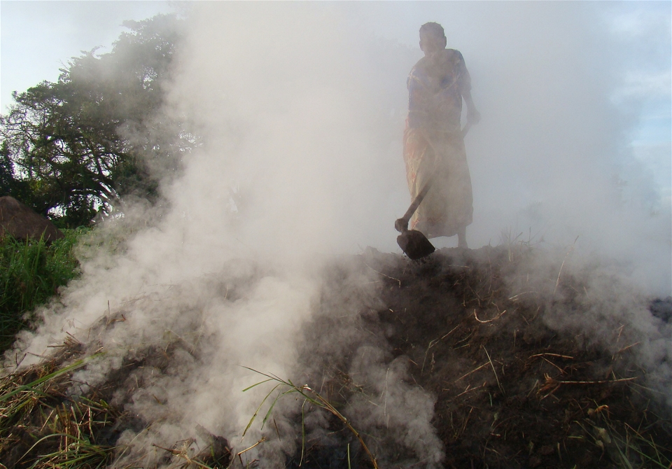A woman on top covered with fuming smoke of burning charcoal in Nwoya district in northern Uganda . © Charles Akena/IRIN
