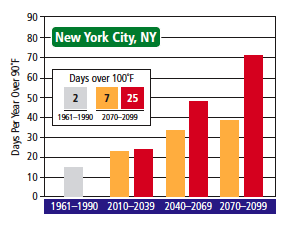 The number of days over 90°F in large northeastern cities is projected to increase in the coming decades until, by late-century, some cities could experience nearly an entire summer of such days under the higheremissions scenario. Projections under this scenario also show a dramatic increase in the currently small number of days over 100°F (as depicted in the inset boxes).