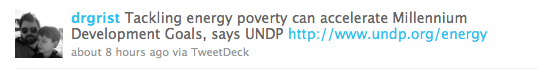 How could we possibly not be excited by the influential David Roberts (Grist) tweeting about the UNDP’s call for greater attention to alleviating energy poverty as a key strategy to achieve the MDGs?
