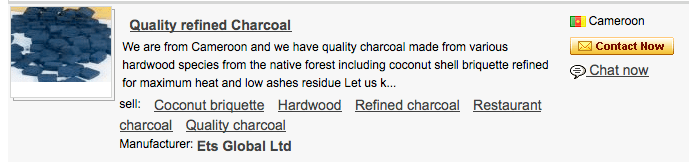 A survey of charcoal for sale on the international market reveals it is widely available in large quantities for export. For reasons I don’t quite understand the main traders appear to be located in Nigeria and Egypt, although China, Thailand, Brazil, Ghana, Cameroon, Mexico, and Argentina also figure prominently. The wood charcoal offered for sale are mostly described as coming from hardwoods, although a Thai trader was also offering mangrove-sourced wood.